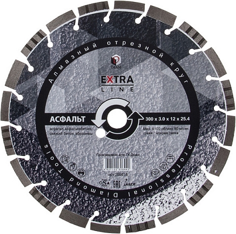 Сегментный алмазный круг Diam Extra Line 1A1RSS Turbo Асфальт 300 мм (Диам Экстра Лайн 1А1РСС Турбо Асфальт 300 мм) – профессиональный алмазный отрезной диск с лазерной сваркой сегментов для сухой и мокрой резки асфальта, асфальтобетона, свежего бетона, пенобетона, абразивного песчаника, шамотного и силикатного кирпича, шамота и других абразивов на резчиках швов, стенорезных машинах, камнерезных станках, электрических плиткорезах и резчиках, бензорезах, как с подачей воды, так и без нее.
