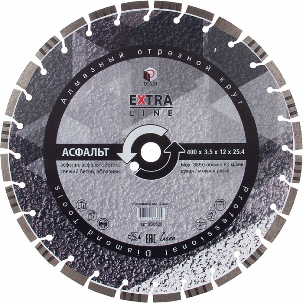 Сегментный алмазный круг Diam Extra Line 1A1RSS Turbo Асфальт 400 мм (Диам Экстра Лайн 1А1РСС Турбо Асфальт 400 мм) – профессиональный алмазный отрезной диск с лазерной сваркой сегментов для сухой и мокрой резки асфальта, асфальтобетона, свежего бетона, пенобетона, абразивного песчаника, шамотного и силикатного кирпича, шамота и других абразивов на резчиках швов, стенорезных машинах, камнерезных станках, электрических резчиках, бензорезах, как с подачей воды, так и без нее.